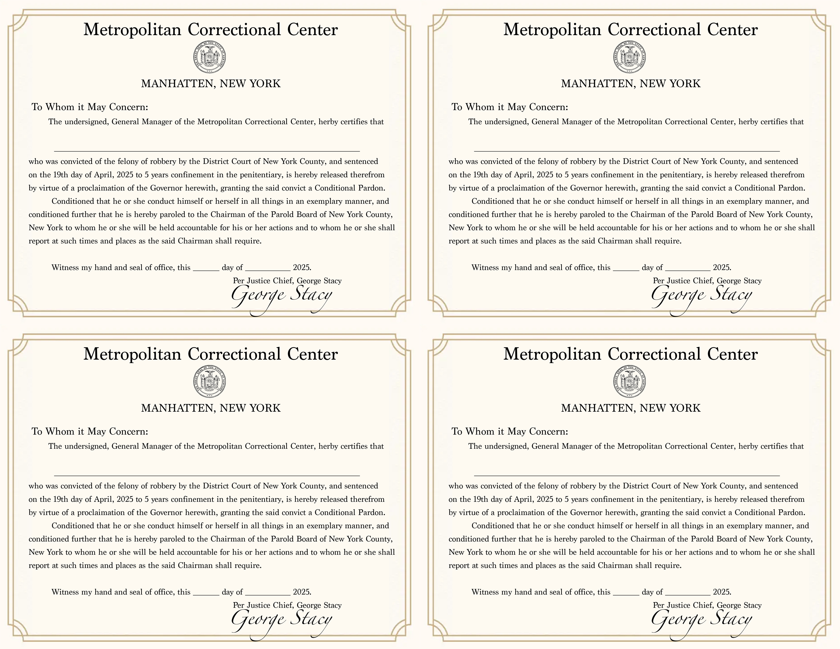 - Printed “parole certificates” and a pen inside each locked pouch