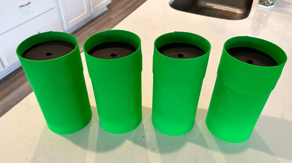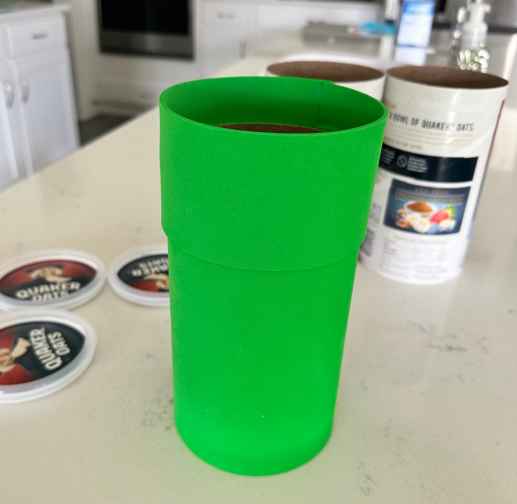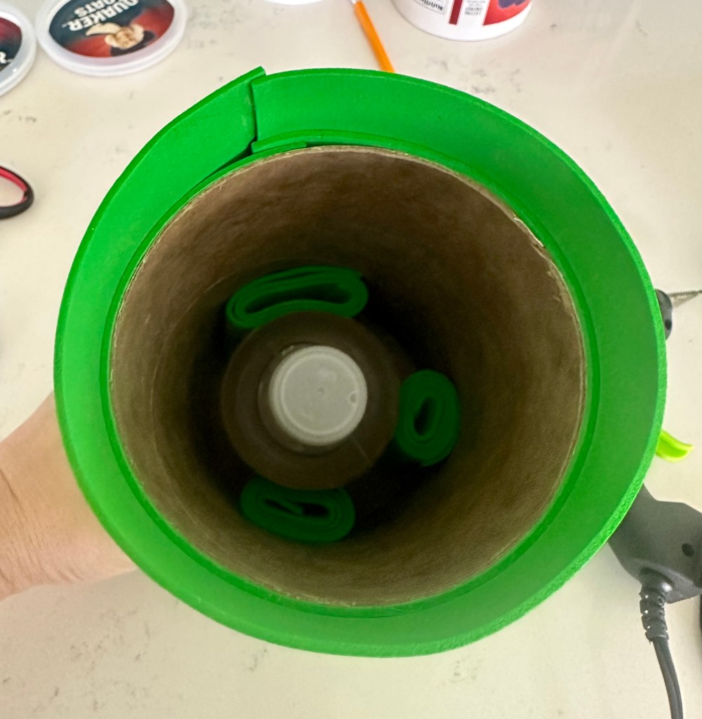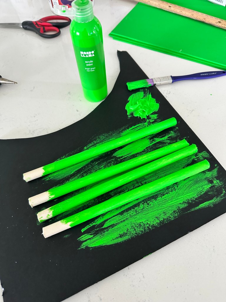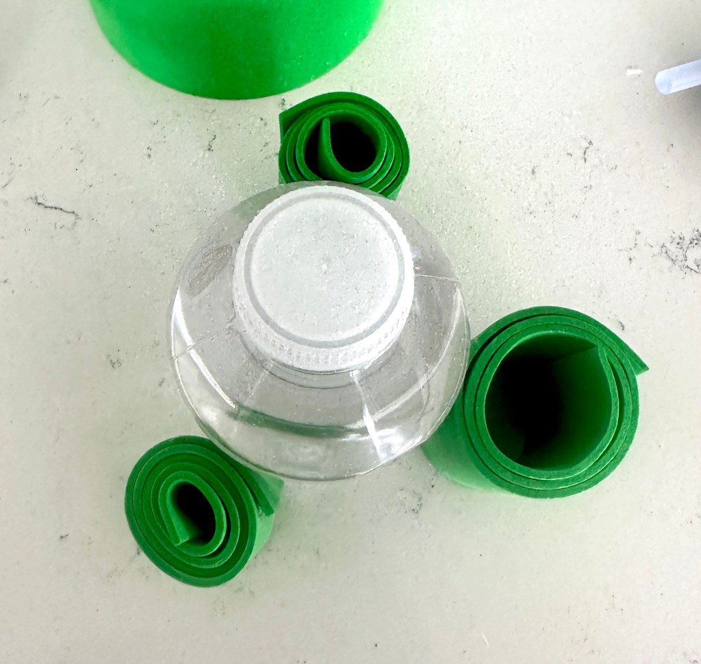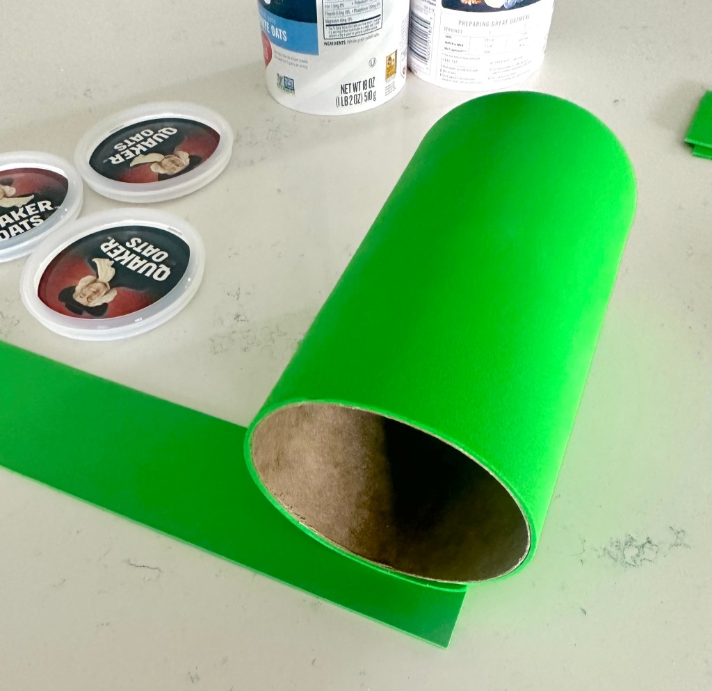 Stand your dowel rod in the center of the circle and trace around that. Cut that little circle in the middle out as well. (The cutting does not need to be perfect. A hot knife makes it easier.). This black piece will be the “soil” of the piranha plant and hold the plant upright. 3. Mark your craft foam where it needs to be cut (see measurements in next photo) by pressing a sharp-edged ruler into it to make nice, straight indents4. Cut your foam where you dented it with the ruler.Note – I made a mistake when I cut mine. The foam for the rim of the piranha plant actually needs to be slightly longer than the foam for the base because it will be wrapping both the canister AND the foam around the canister.5. Hot glue the larger piece of foam around the oatmeal canister, covering it completely. Hot glue the rim around the top edge of the oatmeal canister, letting it sit about 1″ higher than the rim.This is what your oatmeal canister should look like now.6. Take the scrap end of the green foam and cut it into 3 strips. Roll the strips up and add a little glue to secure them (this does not need to be perfect whatsoever!). These will go around the water bottle to hold it in place.7. Drop the water bottle into the center of the base and then squish the 3 rolls of craft foam around it as padding, so it won’t move around inside.8. Set the black foam core circle inside the rim of the base. The base is now complete!9. Paint the dowel rods green. (If you haven’t yet cut them down to 8″ lengths, do that before painting.) You’ll need at least 2 coats of paints. Allow ample time for the coats to dry. Note – you do not need to paint one end as it will be inside the plant base, not visible.10. Use my free printables to print the mouths on white cardstock and the leaves on green cardstock. Cut out the pieces.