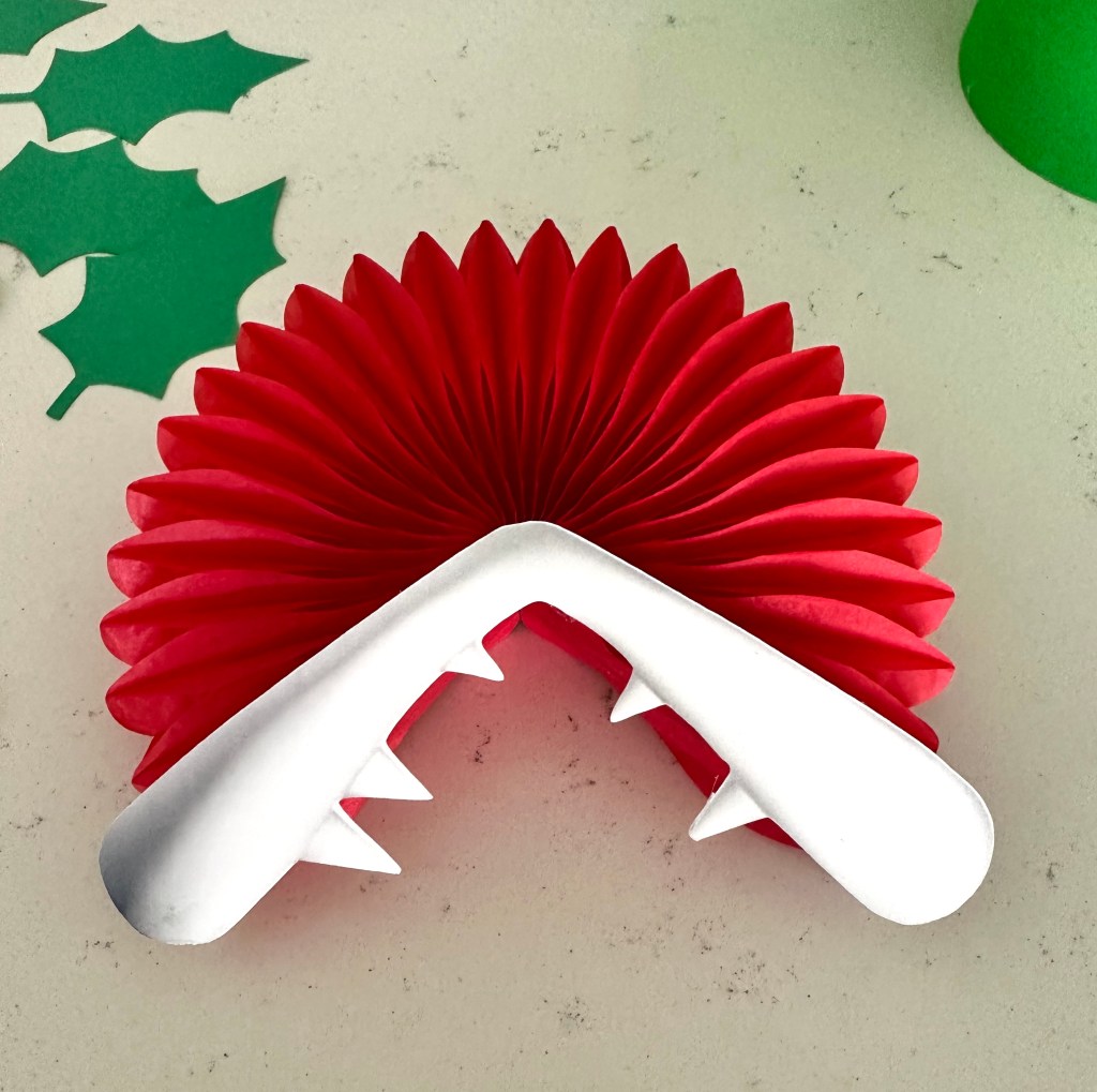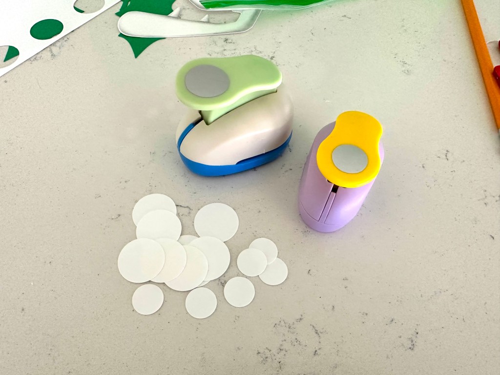 14. Add hot glue on the top end of the dowel rod and scrunch the back of the paper fan over it until it’s secure. You can add a little extra glue to the front of the dowel rod to hold the bottom of the paper fan in place as well.15. Glue the 2 leaves to the back of the dowel rod.When you turn your plant around, it should now look like this!16. Punch some circles out of white card stock using a 1″ circle punch and a 0.6″ circle punch. (If you don’t have circle punches, you could trace around coins and cut the circles out by hand).17. Glue the white circles to the front of the paper fan.Your Piranha plant is now complete and ready to display at your event!