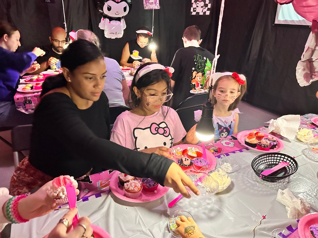 Lined up and ready to toss—this game turned into a crowd favorite in no time.Big sister Abby stepping up with her best aim—Cinnamoroll would be proud.Mallory gave it her best shot for the kids’ team. So much cinnamon roll cuteness in one place!