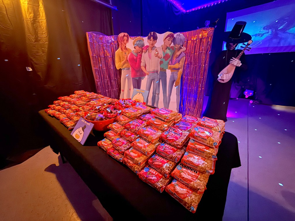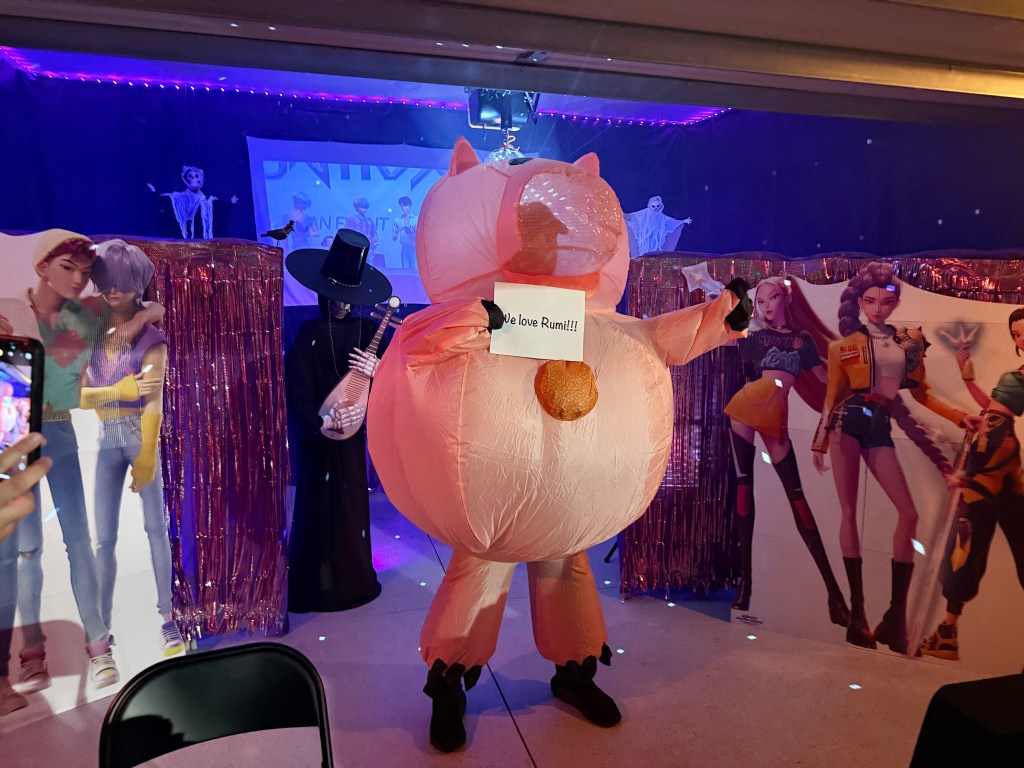 The projector looped the K-Pop Demon Hunters movie. The Bluetooth speaker played the iconic songs loud and clear. The fog swirled, the lights glowed, the disco ball sparkled…it was Halloween magic. K-Pop style.