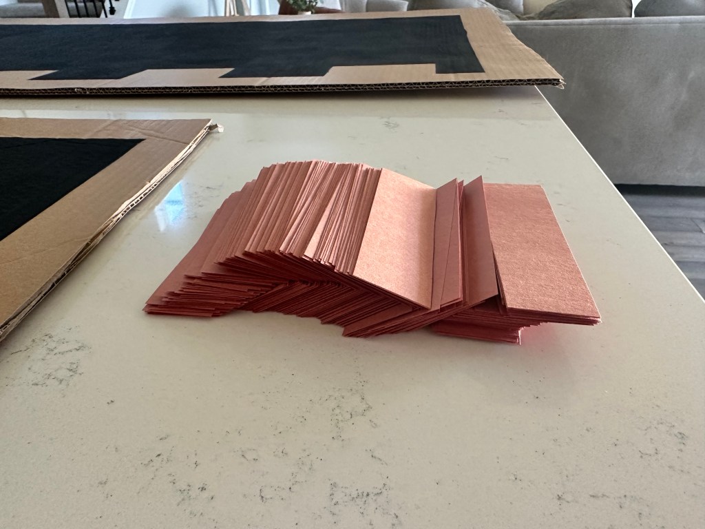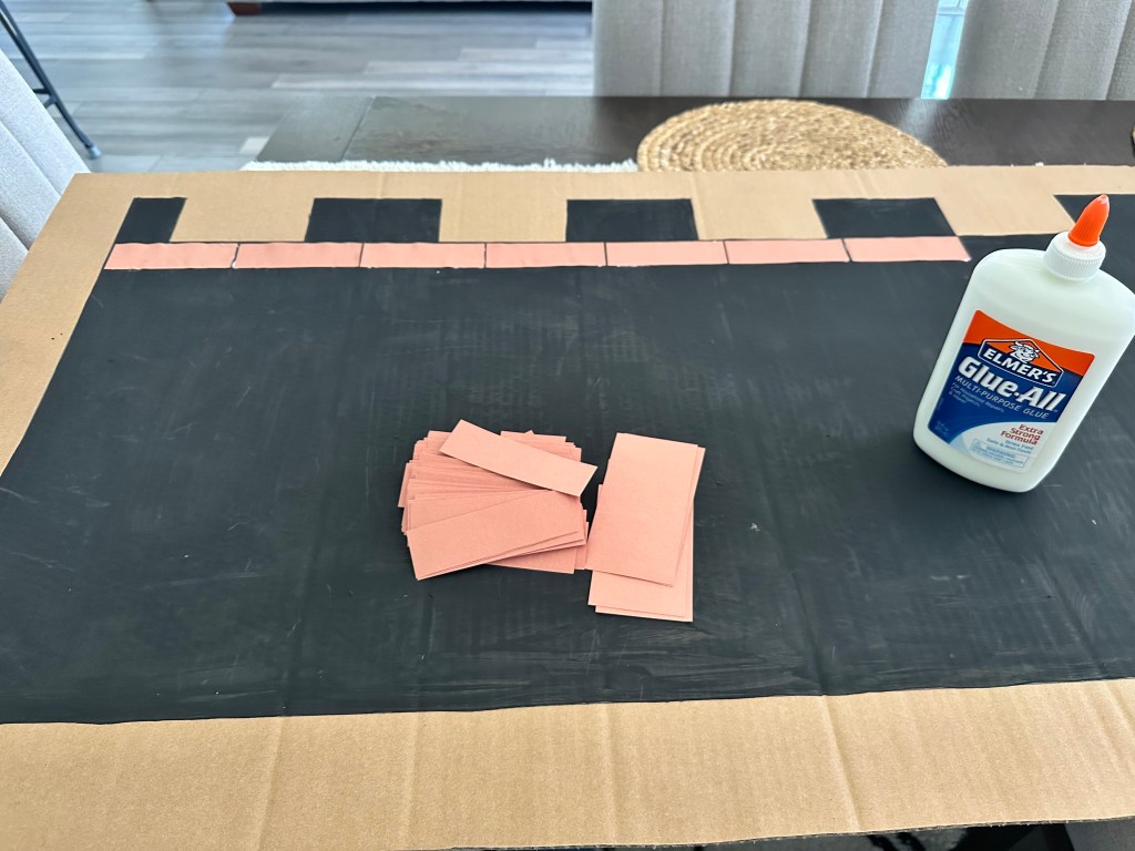 I cut all the bricks using a paper trimmer, which made the process surprisingly fast. It took about 30 minutes and 28 sheets of 9×12 brown construction paper. I also made a few custom brick shapes to fit into the battlements.