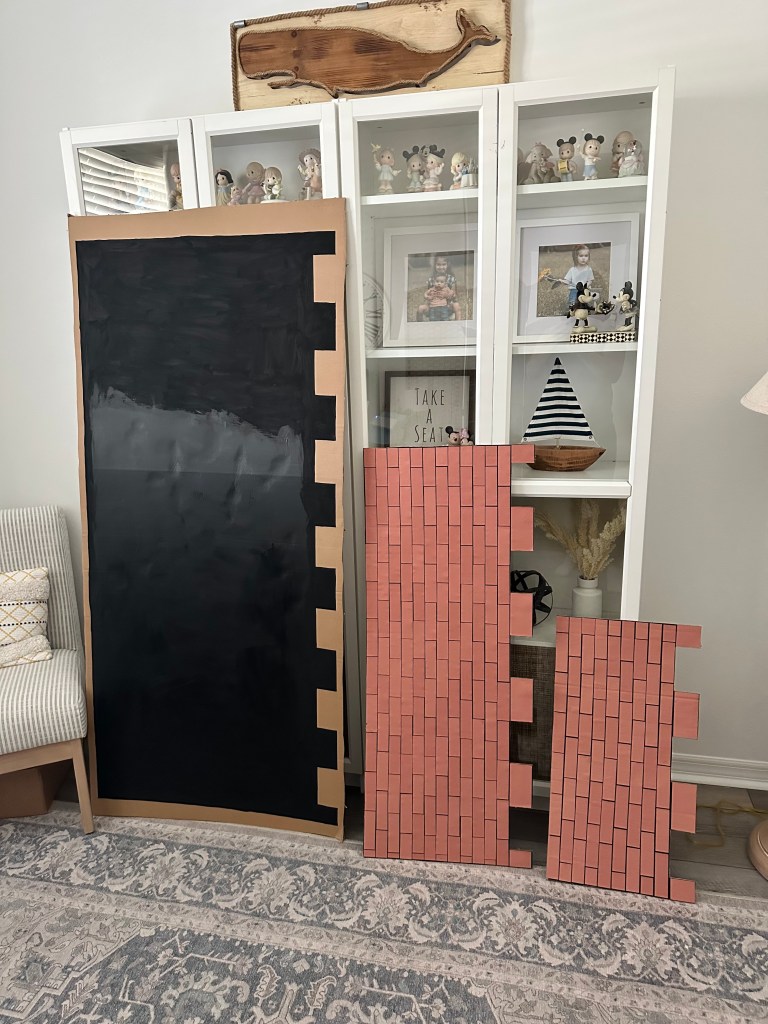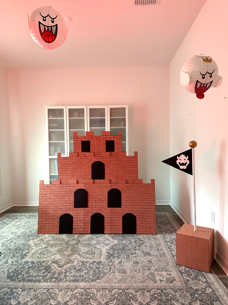 I stored the three pieces flat under my bed until party day so they wouldn’t warp. Then I taped them together with packing tape and propped the finished castle against a piece of furniture. It was the perfect backdrop for our final boss battle.