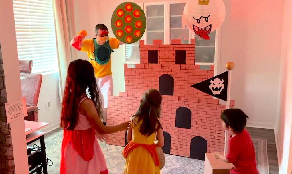 I don’t know if the castle shown at the end of the level in Super Mario 1 is really Bowser’s castle, but this is the one I duplicated for our party to serve as Bowser’s castle.